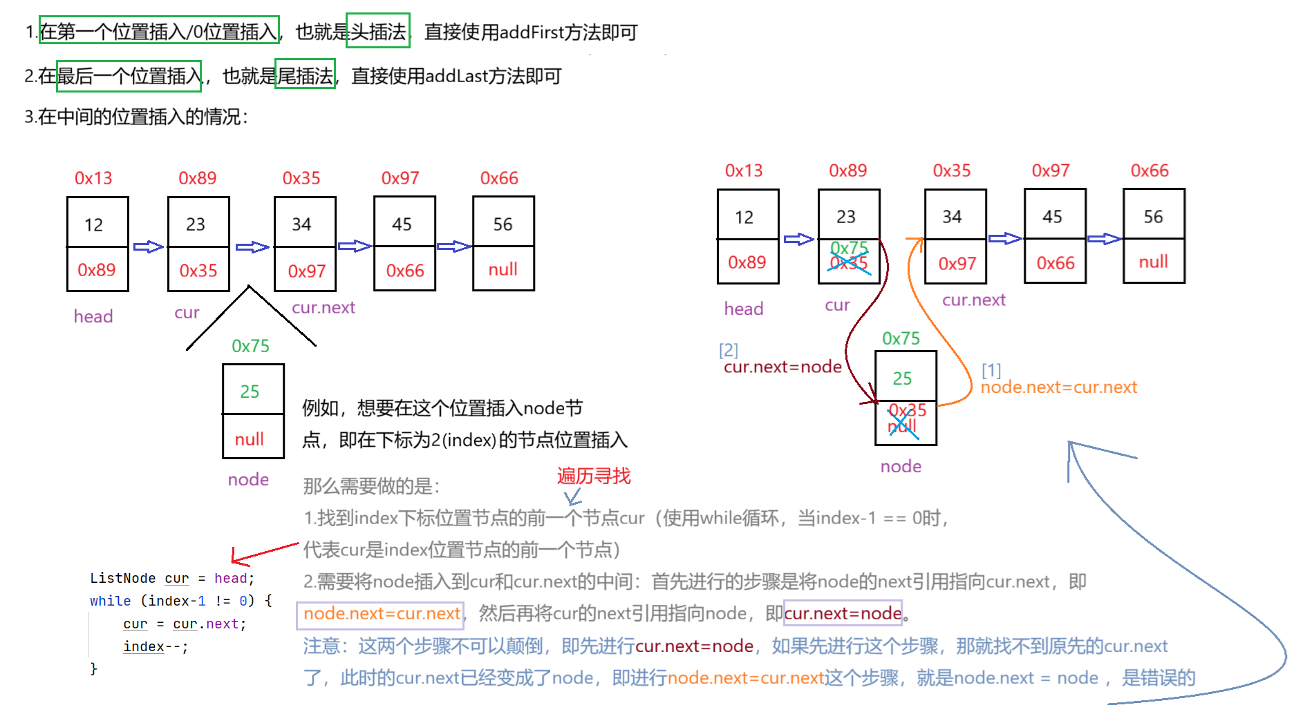 public void addIndex(int index,int date) {try {checkIndex(index);//头插情况if(index == 0) {addFirst(date);return;}//尾插情况if(index == size()) {addLast(date);return;}//中间ListNode node = new ListNode(date);//创建新节点//找到index位置节点的前一个节点ListNode cur = head;while(index-1 != 0) {cur = cur.next;index--;}//此时的cur就是index的前一个节点//插入node.next = cur.next;cur.next = node;}catch(IndexIllegalException e) {e.printStackTrace();}