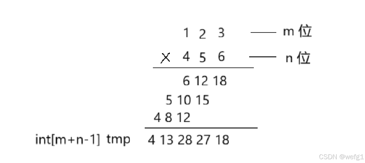 2、把一个数的某位数与另一个数的每一位数相乘,结果 += 到一个 tmp 数组,位置的下标是相乘的两个数的下标之和。