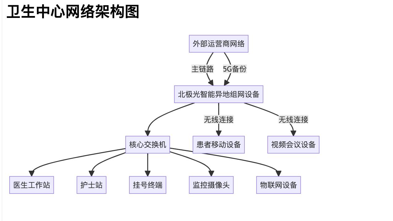 结合卫生中心的需求与难点,设计了一套基于智能组网设备的网络解决方案。这类设备支持最新的WiFi标准和5G网络接入,凭借其高性能硬件规格和灵活的组网功能,在医疗场景中具有显著优势。