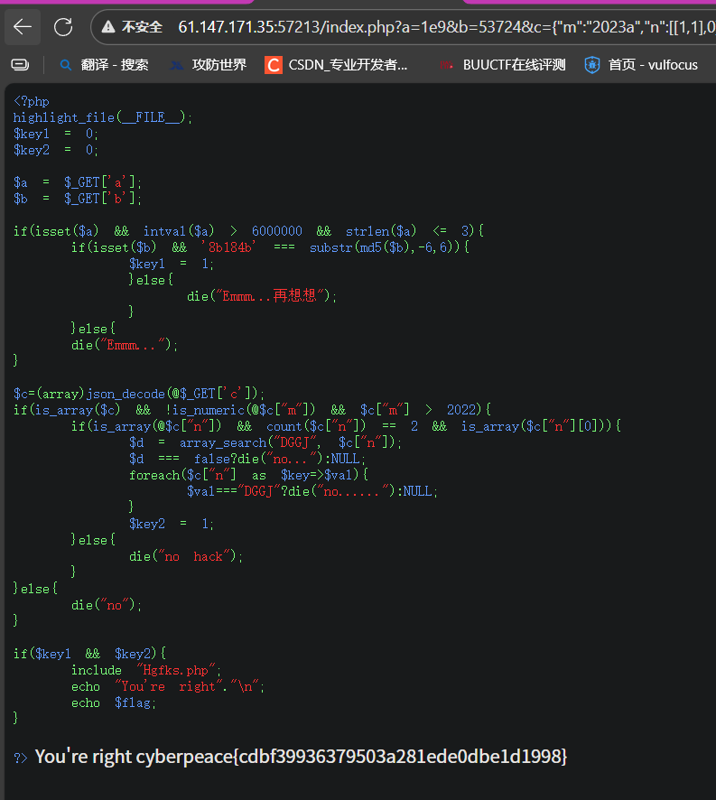 if(is_array($c) && !is_numeric(@$c["m"]) && $c["m"] > 2022){if(is_array(@$c["n"]) && count($c["n"]) == 2 && is_array($c["n"][0])){$d = array_search("DGGJ", $c["n"]);$d === false?die("no..."):NULL;foreach($c["n"] as $key=>$val){$val==="DGGJ"?die("no......"):NULL;}$key2 = 1;}else{die("no hack");}