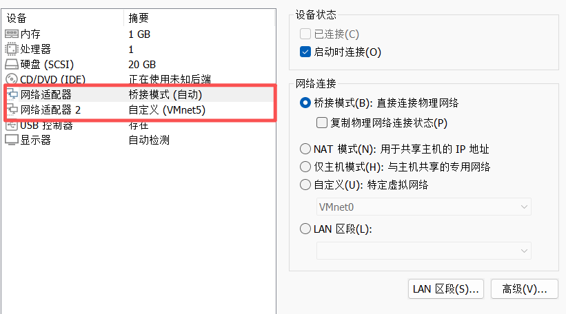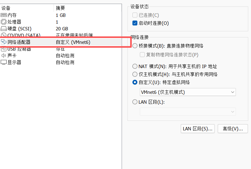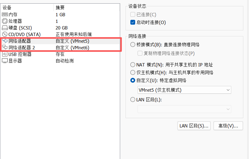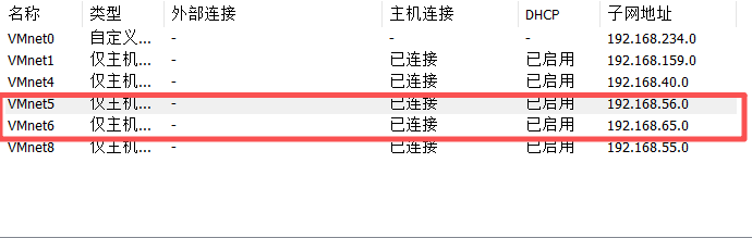 先在vmvare虚拟机的虚拟网络编辑器添加两张网卡用来搭建网络环境,我这里直接就是5网卡对应56网段,6网卡对应65网卡。