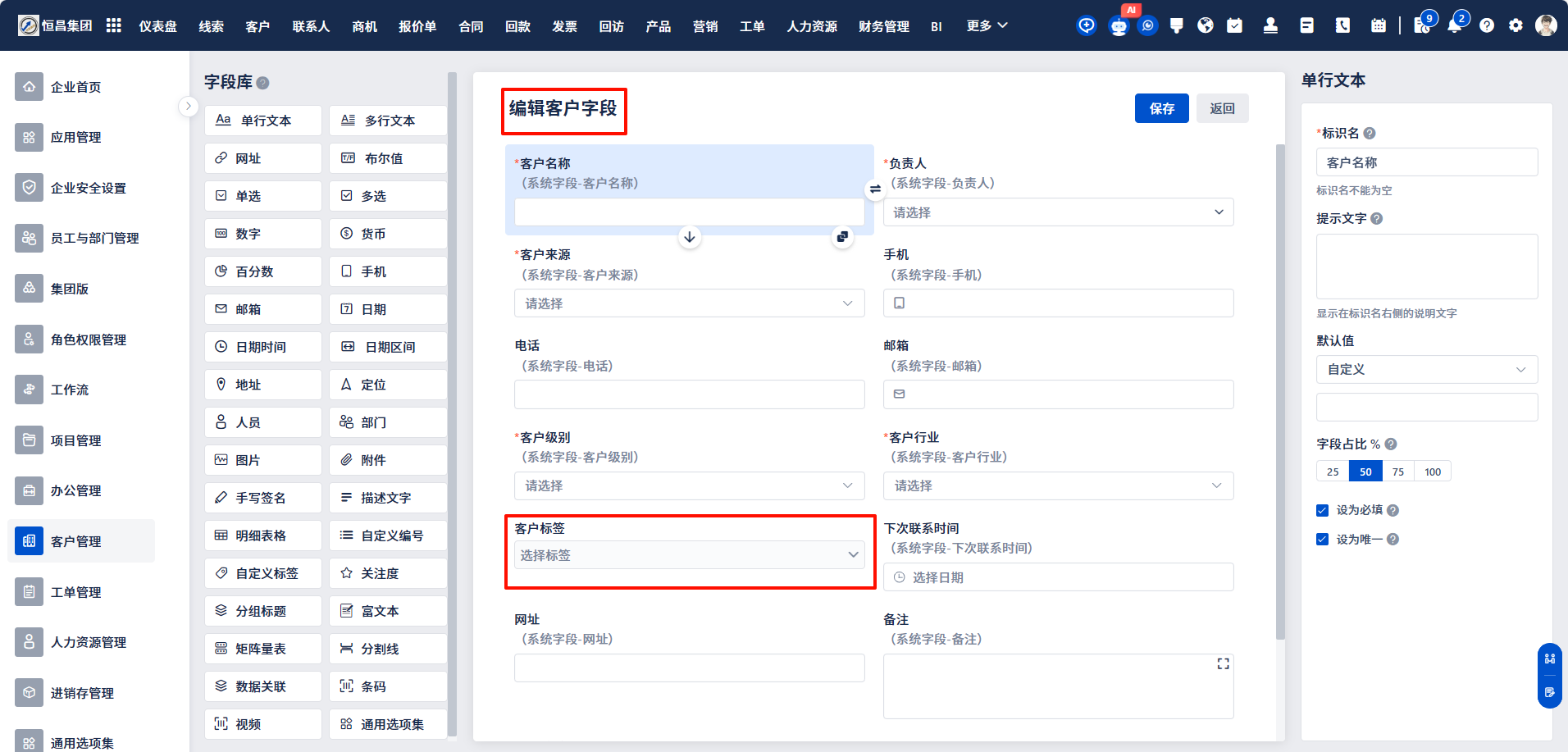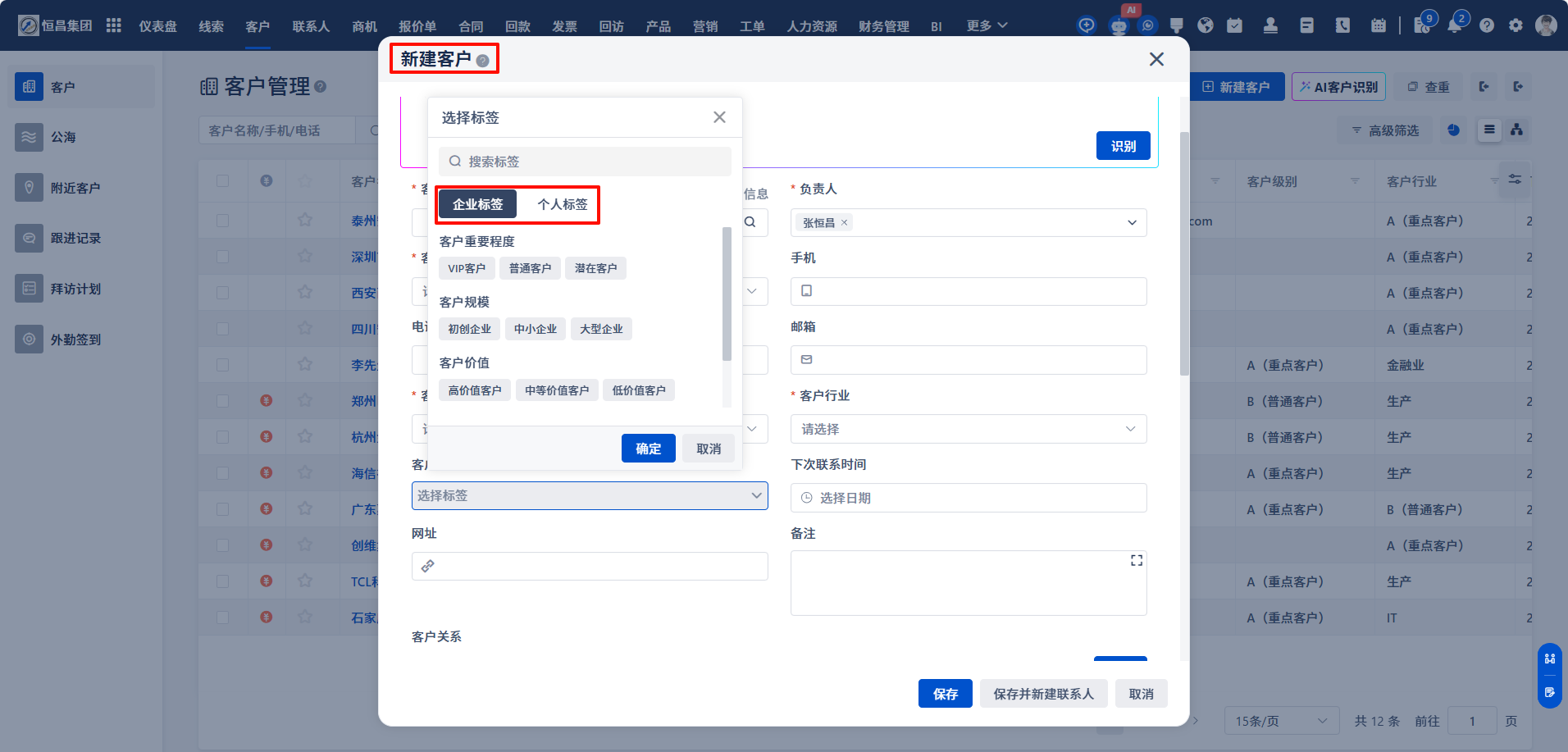 在选择标签页面,有企业标签和个人标签,企业标签自动弹出的是系统默认的标签,有一定的灵活性,允许企业根据自身业务需求添加或修改标签。如果想要修改客户版块的标签,就在客户管理的自定义字段里进行修改。如果是线索版块,则需要在线索管理的自定义字段里进行修改。