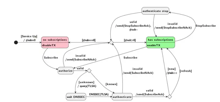 发布者记录名称包含服务名称 / ID、域和车辆信息,格式如 service.domain.vehicle.oem.,前缀还可包含协议信息。订阅者通过验证是否存在与该精确名称匹配且受 DNSSEC 保护的 TLSA 记录,隐式对发布者进行授权,整个过程依赖 DNSSEC 信任链。