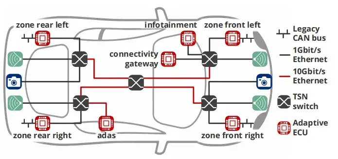 图 2、采用区域拓扑结构的现代车载网络(IVN)
