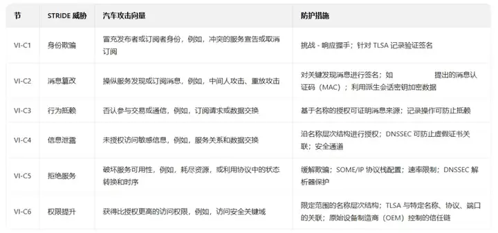 本文采用 STRIDE 威胁模型进行威胁分析,该模型涵盖了欺骗、篡改、否认、信息泄露、拒绝服务和权限提升等关键攻击向量。以 SOME/IP 中间件安全防护为例,阐述这些攻击在汽车面向服务架构(SOA)中的表现,以及本文提出的认证与授权机制如何保护服务发现免受此类攻击,具体总结于表 1。