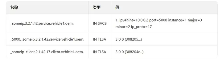 .service. 区域包含 212 个发布者的 SVCB 和 TLSA 记录。SVCB 数据描述与 SOME/IP 宣告消息匹配的发布者信息,使用 RFC 9460支持的自定义键值对。更通用的名称(如 someip.42.service.)下可共存多条 SVCB 记录,这些记录指向相同的发布者数据,但支持查询任何版本和实例的所有记录,这一设计借鉴了 Mueller 等人的方案。TLSA 记录始终与完整服务信息一一对应,且采用 DANE-EE 证书关联类型,无需额外认证机构(CAs)。