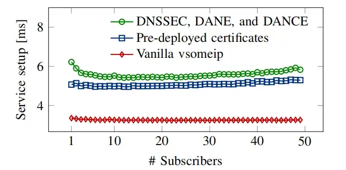 为实现安全通信,所有发布者和订阅者均使用 OpenSSL [61] 生成的唯一证书和密钥(SHA-256 哈希算法,2048 位 RSA 密钥,加密强度约等同于椭圆曲线 prime256v1)。原生 vsomeip 场景不使用任何证书;预部署证书场景中,证书直接链接到应用配置,因此每个发布者都知晓其订阅者的证书;在 DNSSEC、DANE 和 DANCE 场景中,发布者和订阅者仅存储自身私钥,公钥证书通过 DNSSEC 解析获取。