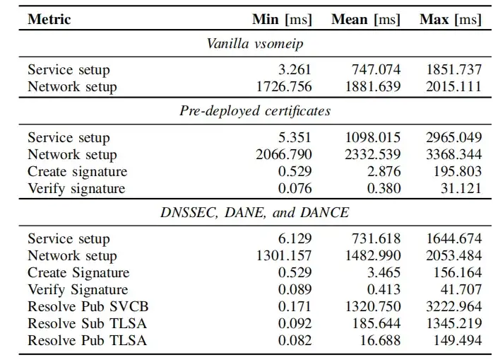 本文测量了服务发现延迟、DNSSEC 查询时间以及相关加密运算的计算开销。通过对比三种方案评估基于 DNSSEC 的认证与授权的影响:(1)原生 vsomeip:添加性能测量统计功能的参考实现;(2)预部署证书:使用静态证书实现发布者和订阅者的完整认证;(3)DNSSEC、DANE 和 DANCE:结合本地 DNS 解析的基于 DNSSEC 的认证与授权。
