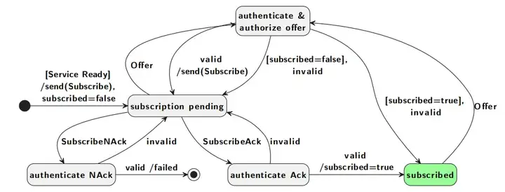 发布者可在其服务宣告中嵌入认证挑战。订阅者则在订阅(subscribe)消息中,使用自身私钥对认证挑战进行签名,并将签名后的响应包含在消息中。订阅者还可在订阅消息中加入挑战,请求发布者进行认证,发布者则在订阅确认(subscribeAck)消息中响应该挑战。