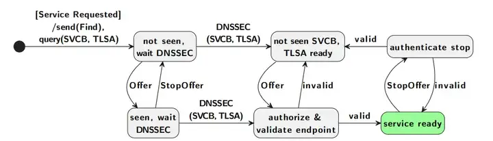 在发现过程中或收到服务宣告后,订阅者会向本地 DNSSEC 解析器查询发布者端点信息,我们选择将这些信息存储在服务绑定(SVCB)记录中,因其具备灵活性和可扩展性。SVCB 支持多种应用层协议编号(ALPNs)(例如,表示基于 TCP 的 HTTPS),并包含相应的地址和端口信息。