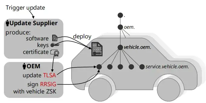 基于 DNSSEC 的命名实体认证(DANE)和面向所有网络客户端的 DANE 认证(DANCE),将密钥和证书存储并签名在 TLSA 记录中。它们在 DNS 层级结构中将证书与命名服务端点绑定,建立从根区域到委托区域的信任链。这不仅避免了 WebPKI PKI中众所周知的认证冲突问题,还特别允许服务资源的证书所有者对服务资源进行独立签名,而 DNS TLSA 记录的所有者对服务部署进行独立签名。我们将利用这一特性,将第三方服务提供商的签名密钥与原始设备制造商(OEM)在汽车中进行的服务安全部署解耦。