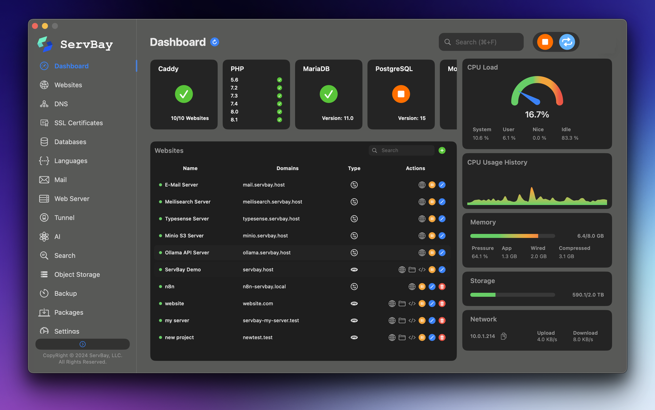 这是我最大发现,也是我目前的主力工具。你可以把它理解为 MAMP 的超级进化版。ServBay 解决了传统集成环境(如 MAMP、XAMPP)的很多痛点。