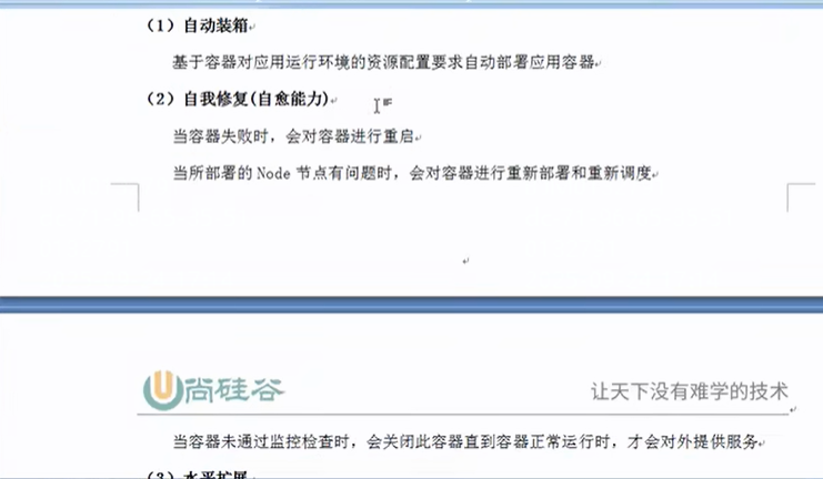 2.自动修复:容器失败,对容器进行重启。当所部署的Node节点有问题时,一般节点是集群形式,会让容器重新调度另外一个没有问题的节点,如果容器没有通过健康检查,会关闭该容器直到容器正常运行,才会对外提供服务。如下第1个节点挂了会启动第2个节点进行使用,第2个节点使用之前要启动,启动过程中如果没通过健康检查(哪的健康检查???)那第2个节点就不对外提供服务