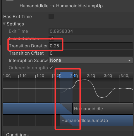 待机动画切换到跳跃动画有0.25s的过渡时间,如果在该过渡时间内进行动画匹配就会出现很奇怪的效果。