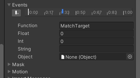 在注意事项中我们知道,必须保证调用时动画并不是出于过渡阶段而真正在播放目标动画。我们制作的动画中,从Idle状态到Jump的状态中有0.25s的过渡时间,在该时间内不能进行动画匹配。因此,可以在动作Jump的Inspector窗口中在0.25s后为其添加一个事件,利用事件来进行动画目标匹配: