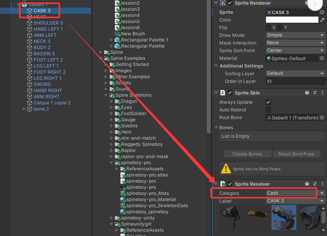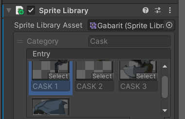 {//sr.SetCategoryAndLabel(sr.GetCategory(), "CASK 1");SpriteResolver[] srs = this.GetComponentsInChildren<SpriteResolver>();for(int i = 0; i < srs.Length; i++){equipDic.Add(srs[i].GetCategory(), srs[i]);}ChangeEquip("Cask", "CASK 1");