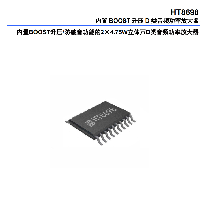 在便携式音频设备飞速发展的当下,用户对音质、续航与设备小型化的需求日益提升,而一款优秀的音频功率放大器,正是串联起这些需求的核心组件。HT8698 作为内置 BOOST 升压模块的立体声 D 类音频功率放大器,凭借对功率、音质、兼容性与安全性的全方位优化,成为适配各类便携式音频设备的 “全能选手”,为厂商打造高性价比产品提供有力支持,也为用户带来更优质的听音体验。
