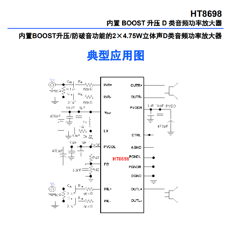 广泛的应用场景,更是 HT8698 综合实力的体现:从蓝牙音箱、便携式音箱、2.1 声道小音箱等专业音频设备,到扩音器、iphone/ipod docking 等实用产品,再到 MP4、导航仪、平板电脑、笔记本电脑、智能手机,甚至小尺寸 LCD 电视 / 监视器、便携式游戏机 —— 几乎所有需要音频放大的便携式或小型设备,都能通过 HT8698 提升音频表现。