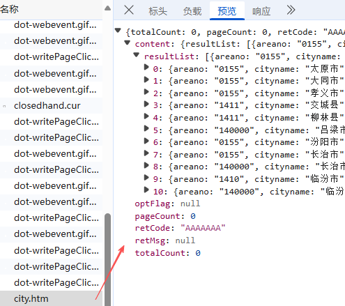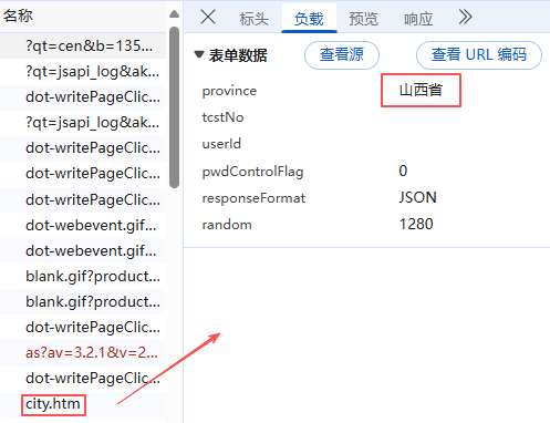 经过测试发现,每查询一个省,会响应一个city.htm的请求,里面是省级行政区,对应的地级行政区,那我们就先生成一个包含34个省、市自治区的list,去遍历所有对应的地级行政区名称,这里解释一下,为什么我们用网站本身的地级市名称,网上不是有公开的地级市名称列表么,1是因为,不是所有地级市都有对应网点数据,它可能返回为空,2是,就是名称叫法不同,比如有的必须输入全名"太原市",有的"太原"就可以;