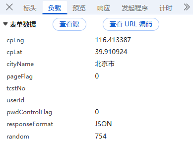 负载:对于POST请求:负载通常包含了传递的参数,因为所有参数都通过URL传递,这里我们可以看到省份行政区的名称,查询城市经纬度等标签,没有进行加密;