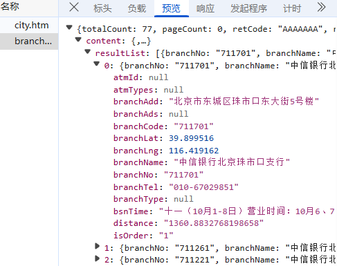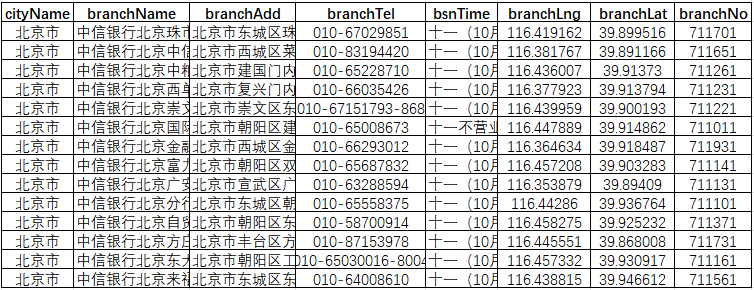获取数据标签如下:branchNo(门店id)、branchName(门店名称)、branchAdd(详细地址)、cityName(门店所在城市)、branchlat&branchlng(地理坐标)、branchTel(门店电话)、bsnTime(营业时间),其他一些非关键标签,这里省略;