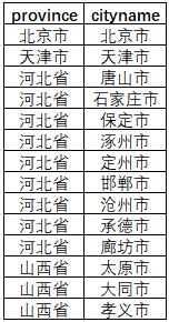 数据会以csv表格的形式,保存在运行脚本的目录下,数据标签包括:province (省级行政区名称)、cityname(地级行政区名称);