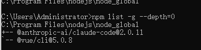 提示找不到cluade命令,应该是没有配置全局,输入一下命令,列出全局安装的包,确认安装成功: