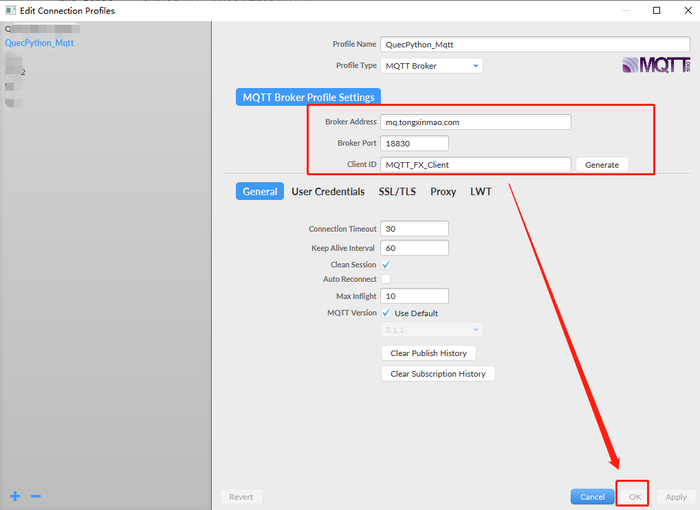本次演示我们在PC端使用MQTT.fx作为客户端A,填入所需的连接参数后进行服务端的连接。