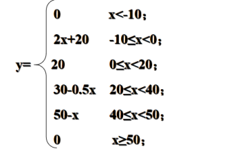 {//定义x,ydouble x,y;//控制台输入printf("输入一个数:");while(1){if(scanf("%lf",&x) == 1)break;elseprintf("输入错误,重新输入!\n");while(getchar() != '\n');}if(x<-10) {y=0;printf("x=%lf,y=%lf",x,y);}else if(x >= -10 && x < 0){y=2*x+20;printf("x=%lf,y=%lf",x,y); }else if(x >= 0 && x < 20){y=20;printf("x=%lf,y=%lf",x,y);}else if(x >= 20 && x < 40){y=30-0.5*x;printf("x=%lf,y=%lf",x,y);}else if(x >= 40 && x < 50){y=50 - x;printf("x=%lf,y=%lf",x,y);}else if(x >= 50){y=0;printf("x=%lf,y=%lf",x,y);}else printf("%lf不在函数定义域内\n",x);return 0;}