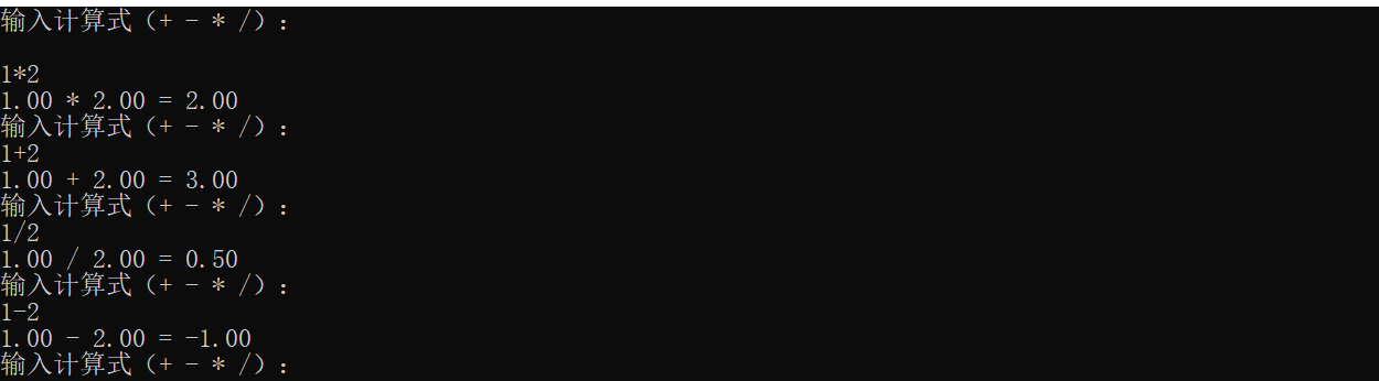 #define LINE "=====================================\n" // 分隔线int main() {// 程序标题printf(COLOR_YELLOW);printf(LINE);printf(" 简易计算器 v1.0 \n");printf(" 支持 + - * / 运算,输入q退出程序 \n");printf(LINE);printf(COLOR_RESET);char op; // 运算符double num1, num2; // 操作数char exitFlag; // 退出标志while (1) {// 输入提示(明确格式)printf("\n请输入计算式(+ - * /):\n");// 循环获取有效输入while (1) {// 先检查是否输入了退出指令(q或Q)if (scanf("%c", &op) == 1 && (op == 'q' || op == 'Q')) {printf("\n"LINE);printf("感谢使用,程序已退出!\n");printf(LINE COLOR_RESET);return 0; // 退出程序}// 若不是退出指令,回退输入流(因为上面读取了一个字符)ungetc(op, stdin);// 读取计算式(数字+运算符+数字)if (scanf("%lf%c%lf", &num1, &op, &num2) == 3) {// 检查运算符是否合法(提前过滤,减少switch的default触发)if (op == '+' || op == '-' || op == '*' || op == '/') {break; // 输入有效,退出输入循环} else {printf(COLOR_RED"输入错误:运算符必须是 + - * / 中的一种!\n"COLOR_RESET);}} else {printf(COLOR_RED"输入格式错误!请按 数字+运算符+数字 格式输入(例如:3.5*2)\n"COLOR_RESET);}// 清空输入缓冲区(处理错误输入残留)while (getchar() != '\n');}// 计算并输出结果(用绿色突出显示)printf(LINE); // 结果区分隔线switch (op) {case '+':printf(COLOR_GREEN"%.2lf + %.2lf = %.2lf\n"COLOR_RESET, num1, num2, num1 + num2);break;case '-':printf(COLOR_GREEN"%.2lf - %.2lf = %.2lf\n"COLOR_RESET, num1, num2, num1 - num2);break;case '*':printf(COLOR_GREEN"%.2lf * %.2lf = %.2lf\n"COLOR_RESET, num1, num2, num1 * num2);break;case '/':if (num2 != 0) {printf(COLOR_GREEN"%.2lf / %.2lf = %.2lf\n"COLOR_RESET, num1, num2, num1 / num2);} else {printf(COLOR_RED"错误:除数不能为0!\n"COLOR_RESET);}break;}printf(LINE); // 结果区结束分隔线// 询问是否继续printf("是否继续计算?(输入任意键继续,输入q退出):");// 清空缓冲区残留的换行符while (getchar() != '\n');scanf("%c", &exitFlag);if (exitFlag == 'q' || exitFlag == 'Q') {printf("\n"LINE);printf("感谢使用,程序已退出!\n");printf(LINE COLOR_RESET);break;}}return 0;