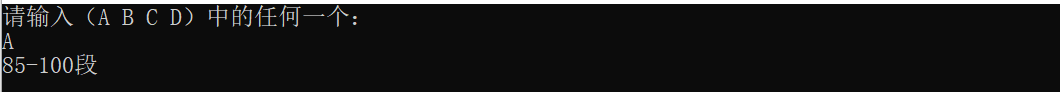 {//创建一个变量,存放等级char grade;printf("请输入(A B C D)中的任何一个:\n");while(1){if(scanf("%c",&grade) == 1)break;elseprintf("请重新输入:\n");while(getchar() == '\n');}//校验switch (grade){case 'A':printf("85-100段\n");break;case 'B':printf("70-84段\n");break;case 'C':printf("60-69段\n");break;case 'D':printf("不及格\n");default:}