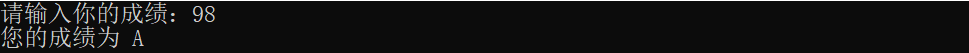{//定义一个成绩float score;//控制台输入printf("请输入你的成绩:");while(1){if(scanf("%f",&score) == 1)break;elseprintf("请重新输入:");//清除缓存while(getchar() != '\n');}if(score >= 90) printf("您的成绩为 A\n");else if(score >= 80 && score < 90) printf("您的成绩为 B\n");else if(score >= 60 && score < 80) printf("您的成绩为 C\n");else if(score < 60 ) printf("您的成绩为 D\n");return 0;