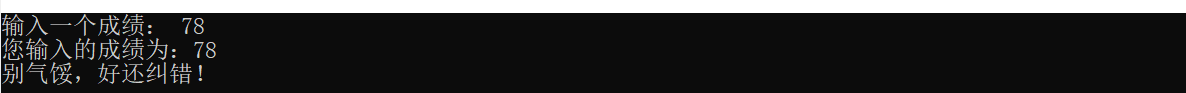 {//定义一个成绩int secor;//控制台输入printf("输入一个成绩:");while(1){if(scanf("%d",&secor) == 1)break;elseprintf("输入错误,重新输入:");//清理缓存while(getchar() != '\n');}//验证输入printf("您输入的成绩为:%d\n",secor);//多分支结构if(secor <= 100 && secor>=90)printf("成绩真棒,继续加油!\n");else if(secor <90 && secor>=80) printf("还不错,继续加油!\n");else if(secor <80 && secor>=70) printf("别气馁,好还纠错!\n");else if(secor <70 && secor>=60) printf("好好学习天天向上!\n");else if(secor <60 && secor>=0) printf("好好学习,天天向上!\n");else printf("输入成绩无效!"); return 0;