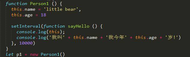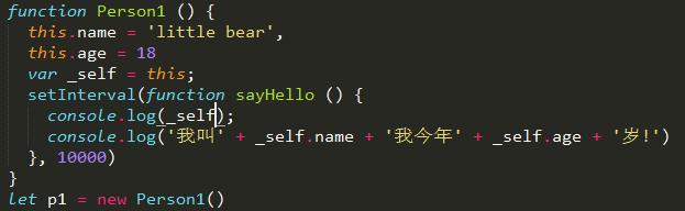 下面我们做一个修改,将this存为一个变量,此时的this指向Person1,也可以使用bind函数来绑定this实现以下效果