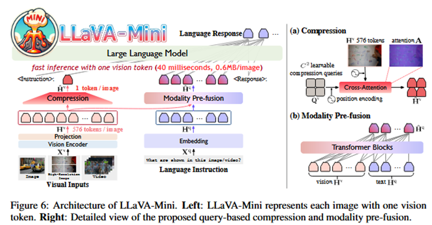 1.模态预融合 (Modality Pre-fusion): 既然融合只在浅层发生,那么完全可以将这个过程移到LLM外部提前进行。LLaVA-Mini设计了一个“预融合模块”,让文本token在进入LLM主干之前,就与所有的原始视觉token进行交互,提前完成信息融合。