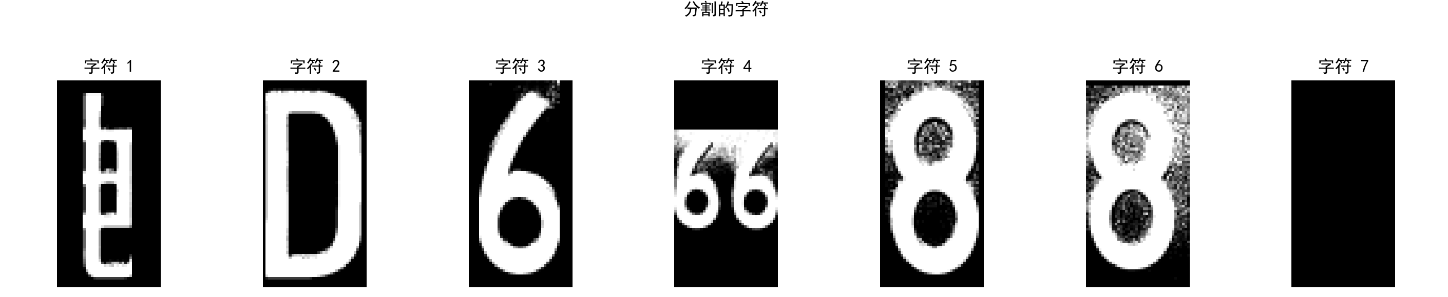 def segment_chars(plate_img):"""字符分割:多策略二值化+修复,保证字符为白色前景"""# 转为灰度图gray = cv2.cvtColor(plate_img, cv2.COLOR_BGR2GRAY) if len(plate_img.shape) == 3 else plate_img.copy()gray = cv2.equalizeHist(gray) # 增强对比度show_image(gray, "增强对比度的灰度图")# 多策略二值化(生成6种候选)_, otsu_bin = cv2.threshold(gray, 0, 255, cv2.THRESH_BINARY + cv2.THRESH_OTSU)_, otsu_bin_inv = cv2.threshold(gray, 0, 255, cv2.THRESH_BINARY_INV + cv2.THRESH_OTSU)adap_gauss1 = cv2.adaptiveThreshold(gray, 255, cv2.ADAPTIVE_THRESH_GAUSSIAN_C,cv2.THRESH_BINARY, 15, 3)adap_gauss1_inv = cv2.adaptiveThreshold(gray, 255, cv2.ADAPTIVE_THRESH_GAUSSIAN_C,cv2.THRESH_BINARY_INV, 15, 3)adap_gauss2 = cv2.adaptiveThreshold(gray, 255, cv2.ADAPTIVE_THRESH_GAUSSIAN_C,cv2.THRESH_BINARY, 21, 4)adap_gauss2_inv = cv2.adaptiveThreshold(gray, 255, cv2.ADAPTIVE_THRESH_GAUSSIAN_C,cv2.THRESH_BINARY_INV, 21, 4)# 评估二值化结果(选择字符最清晰的)candidates = [(otsu_bin, "OTSU阈值"),(otsu_bin_inv, "OTSU阈值反转"),(adap_gauss1, "自适应高斯(15,3)"),(adap_gauss1_inv, "自适应高斯反转(15,3)"),(adap_gauss2, "自适应高斯(21,4)"),(adap_gauss2_inv, "自适应高斯反转(21,4)")]def evaluate(bin_img):"""评估二值化质量:白色占比10%-40% + 连通区域5-10个"""white_ratio = np.sum(bin_img == 255) / (bin_img.size + 1e-6)contours, _ = cv2.findContours(bin_img, cv2.RETR_EXTERNAL, cv2.CHAIN_APPROX_SIMPLE)valid_cnts = [c for c in contours if cv2.contourArea(c) > 50]score = 0if 0.1 < white_ratio < 0.4: score += 2if 5 <= len(valid_cnts) <= 10: score += 3return score# 选择得分最高的二值化scored = [(evaluate(b), b, name) for b, name in candidates]scored.sort(reverse=True, key=lambda x: x[0])best_score, binary, bin_method = scored[0]show_image(binary, f"最佳二值化({bin_method},得分{best_score})")# 强制字符为白色前景if np.sum(binary == 255) < binary.size * 0.1:binary = cv2.bitwise_not(binary)show_image(binary, "反转后二值化(确保字符为白)")# 形态学优化(根据字符密度选择操作)kernel = cv2.getStructuringElement(cv2.MORPH_RECT, (2, 2))white_ratio = np.sum(binary == 255) / (binary.size + 1e-6)if white_ratio < 0.1:binary = cv2.morphologyEx(binary, cv2.MORPH_DILATE, kernel, iterations=1)elif white_ratio > 0.4:binary = cv2.morphologyEx(binary, cv2.MORPH_ERODE, kernel, iterations=1)else:binary = cv2.morphologyEx(binary, cv2.MORPH_CLOSE, kernel, iterations=1)show_image(binary, "形态学优化后二值化")# 垂直投影分析vertical_proj = np.sum(binary, axis=0)if np.max(vertical_proj) == 0:print("警告:投影无信号,启用备用分割")return fallback_segmentation(gray)plt.figure(figsize=(10, 3))plt.plot(vertical_proj)plt.title("垂直投影分布")plt.grid(alpha=0.3)plt.show()# 动态分割阈值proj_norm = vertical_proj / np.max(vertical_proj)proj_std = np.std(proj_norm)threshold = max(0.05, min(0.2, 0.1 + proj_std * 0.3))print(f"动态分割阈值: {threshold:.2f}")height, width = binary.shapechars = []start, in_char = 0, Falsemin_char_w = max(5, width // 30)max_char_w = width // 3char_h_thresh = 0.2 * height# 滑动窗口分割for i in range(width):if proj_norm[i] > threshold and not in_char:start, in_char = i, Trueelif proj_norm[i] <= threshold and in_char:char_w = i - startif min_char_w < char_w < max_char_w:char_img = binary[:, start:i]char_h = np.sum(np.sum(char_img, axis=1) > 0)if char_h_thresh < char_h < height:fixed_char = fix_black_char(char_img) # 修复黑色字符char_img = resize_and_center(fixed_char, (40, 80))chars.append(char_img)show_image(char_img, f"分割字符 {len(chars)}")in_char = False# 处理最后一个字符if in_char:char_w = width - startif min_char_w < char_w < max_char_w:char_img = binary[:, start:]char_h = np.sum(np.sum(char_img, axis=1) > 0)if char_h_thresh < char_h < height:fixed_char = fix_black_char(char_img)char_img = resize_and_center(fixed_char, (40, 80))chars.append(char_img)# 粘连字符分割if len(chars) < 7:refined = []avg_w = width / 7for char in chars:if char.shape[1] > 1.5 * avg_w:dist = cv2.distanceTransform(char, cv2.DIST_L2, 5)dist = cv2.normalize(dist, None, 0, 1, cv2.NORM_MINMAX)split_pts = np.argsort(np.sum(dist, axis=0))[:2]if len(split_pts) > 0 and split_pts[0] > min_char_w and char.shape[1] - split_pts[0] > min_char_w:refined.extend([resize_and_center(char[:, :split_pts[0]], (40, 80)),resize_and_center(char[:, split_pts[0]:], (40, 80))])else:refined.append(char)else:refined.append(char)chars = refined# 补全为7个字符while len(chars) < 7:chars.append(np.zeros((80, 40), dtype=np.uint8))if len(chars) > 7:chars = chars[:7]# 最终修复每个字符return [fix_black_char(c) for c in chars]def fix_black_char(char_img):"""白色占比<20%则反转"""white_pix = np.sum(char_img == 255)total_pix = char_img.sizeif white_pix / total_pix < 0.2:inverted = cv2.bitwise_not(char_img)if np.sum(inverted == 255) / total_pix > 0.2:return invertedreturn char_imgdef fallback_segmentation(gray_img):"""备用分割:7等分"""print("启用备用分割")_, binary = cv2.threshold(gray_img, 0, 255, cv2.THRESH_BINARY + cv2.THRESH_OTSU)binary = cv2.morphologyEx(binary, cv2.MORPH_CLOSE, cv2.getStructuringElement(cv2.MORPH_RECT, (2, 2)), iterations=1)height, width = binary.shapechars = []seg_w = max(1, width // 7)for i in range(7):start = i * seg_wend = min((i + 1) * seg_w, width)char_img = binary[:, start:end]fixed_char = fix_black_char(char_img)char_img = resize_and_center(fixed_char, (40, 80))chars.append(char_img)show_image(char_img, f"备用分割字符 {i + 1}")return charsdef resize_and_center(char_img, target_size):"""字符归一化:统一尺寸并居中,确保白色字符"""target_w, target_h = target_sizeh, w = char_img.shapeif w == 0 or h == 0:return np.zeros((target_h, target_w), dtype=np.uint8)# 缩放scale = min(target_w / w, target_h / h)new_w, new_h = int(w * scale), int(h * scale)resized = cv2.resize(char_img, (new_w, new_h), interpolation=cv2.INTER_