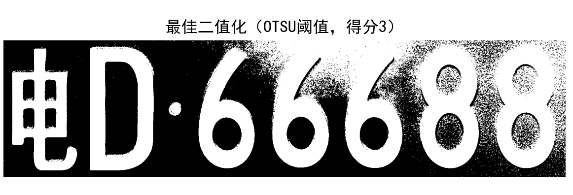 - 二值化:对矫正后的车牌图像,用自适应阈值分割(如 OTSU 算法)处理光照不均,将字符(深色)与背景(浅色)分离。