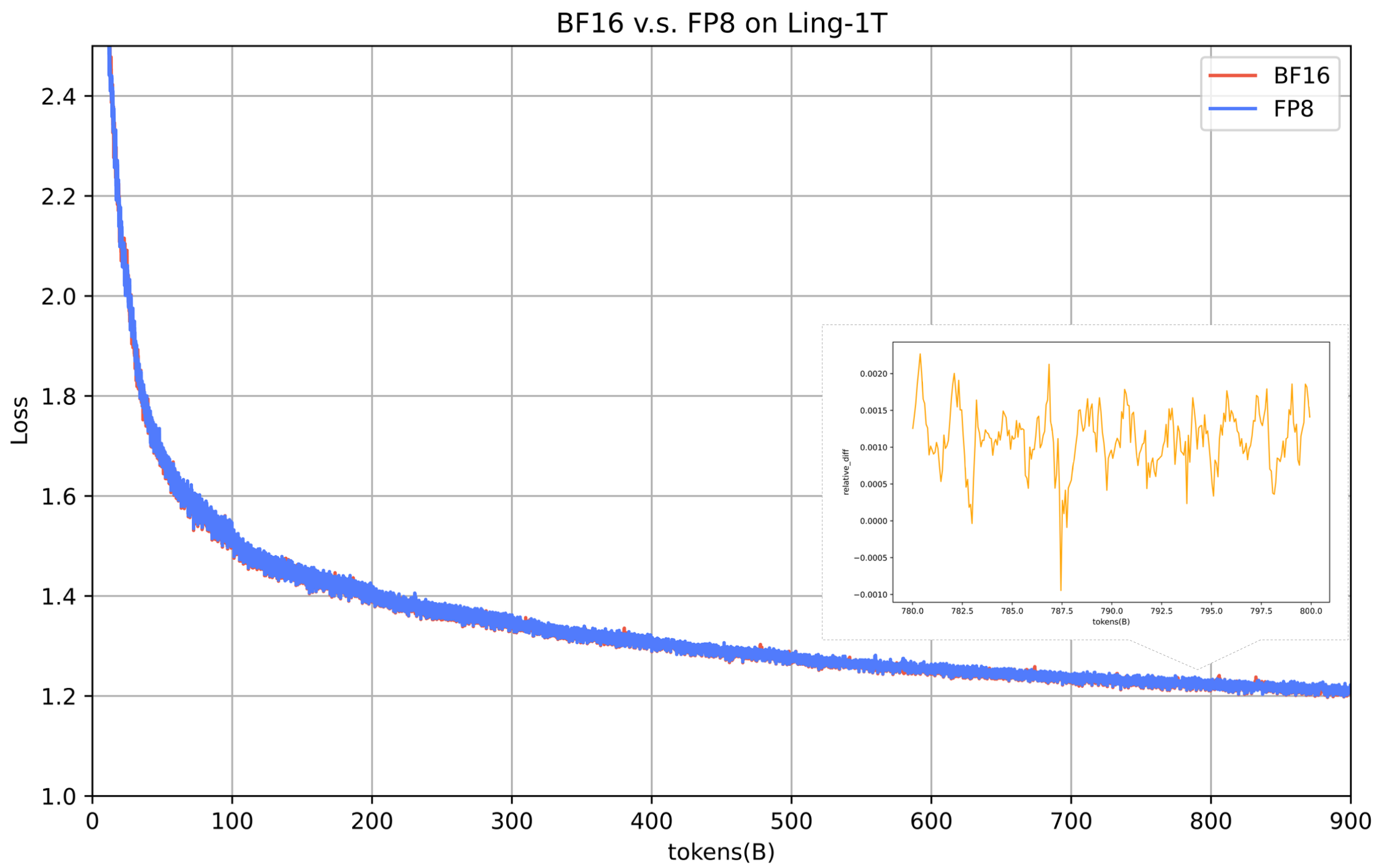 >> 架构与训练创新 (Architecture and Training Innovations): Ling 2.0 架构从头开始设计,以实现万亿规模的效率,遵循 Ling 定律 (Ling Scaling Law, arXiv:2507.17702)。 采用 1T 总参数 / 50B 活跃参数,MoE 激活比例为 1/32。采用 MTP 层以增强组合推理能力;采用无辅助损失 (Aux-loss-free)、Sigmoid 评分的专家路由,并带有零均值更新;采用 QK 归一化以实现完全稳定的收敛。 是迄今为止已知最大的 FP8 训练基础模型。FP8 混合精度训练提供了 15%+ 的端到端加速和改进的内存效率,且在 1T tokens 上与 BF16 的损失偏差保持在 ≤ 0.1%。