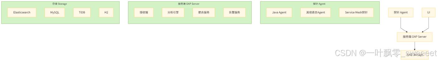 - 服务端(OAP Server):接收探针发送的数据,进行分析、聚合和存储,并提供查询接口。