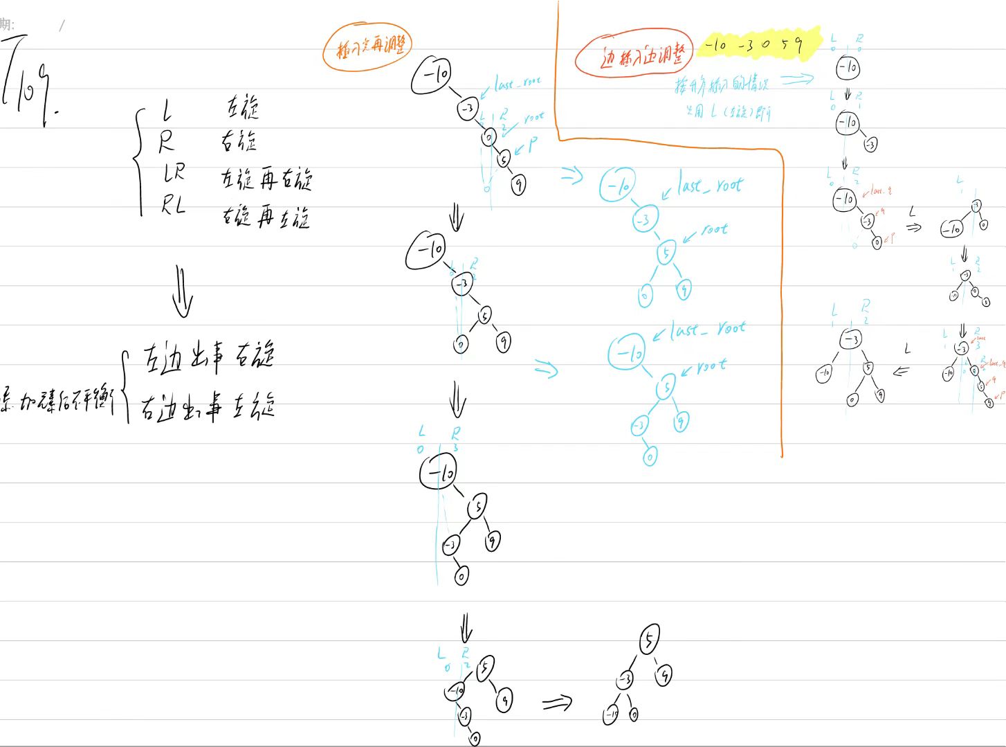 class Solution {private int countTreeHeight(TreeNode root){if(root == null)return 0;int left = countTreeHeight(root.left);int right = countTreeHeight(root.right);return Integer.max(left, right) + 1;}public TreeNode sortedListToBST(ListNode head) {TreeNode root = null;TreeNode p = null;//插入根结点if(head != null){root = new TreeNode(head.val);p = root;head = head.next;}//后面边插入边调整while(head != null){p.right = new TreeNode(head.val);p = p.right;//插入后破坏平衡,检查有无破坏平衡//找到破坏平衡的最小子树【对应树的根结点为last_q,对应子树的父母为last】TreeNode last = null;TreeNode last_q = null;TreeNode q = root; while(q != null){int left = countTreeHeight(q.left);int right = countTreeHeight(q.right); //破坏了平衡的情况if(right - left >= 2){//找最小破坏平衡的子树while(right - left >= 2){last = last_q;last_q = q;q = q.right;left = countTreeHeight(q.left);right = countTreeHeight(q.right); }//左旋调整if(last_q == root){ //要调整根结点的情况last_q.right = q.left;q.left = last_q;root = q;}else{ //不用调整根结点的情况last_q.right = q.left;q.left = last_q; last.right = q;}//重置检查last = null;last_q = null;q = root; }//没有破坏平衡,继续往下找else{last = last_q;last_q = q;q = q.right;}}head = head.next;}return root;}