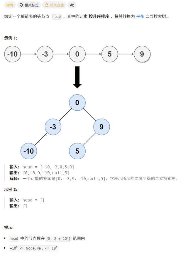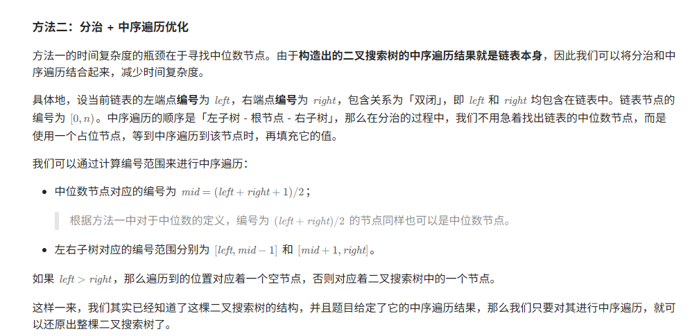 class Solution {ListNode globalHead;public TreeNode sortedListToBST(ListNode head) {globalHead = head;int length = getLength(head);return buildTree(0, length - 1);}public int getLength(ListNode head) {int ret = 0;while (head != null) {++ret;head = head.next;}return ret;}public TreeNode buildTree(int left, int right) {if (left > right) {return null;}int mid = (left + right + 1) / 2;TreeNode root = new TreeNode();root.left = buildTree(left, mid - 1);root.val = globalHead.val;globalHead = globalHead.next;root.right = buildTree(mid + 1, right);return root;}