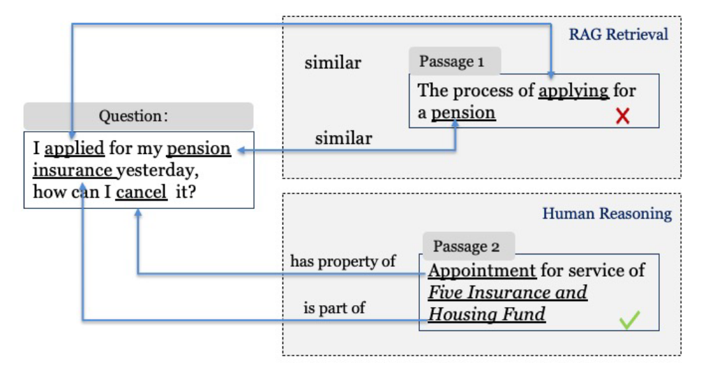 现有的RAG方法缺乏逻辑连贯性,如图1中的例子所示。在目前的RAG方法中,检索是基于相似性的,而生成是基于共现(co-occurrence)的。相比之下,人类首先理解问题的语义,即主体、条件和行动是什么。在搜索过程中,人们关注与问题有同义、从属或因果关系的对象,如"养老保险→是→五险一金的一部分"或"视障人士→需要→拐杖",而不是类似的"养老金"或"残疾人"。 这些差异使得现有的RAG无法在法律、医学和科学等专业领域产生正确的答案,而分析推理在这些领域至关重要。