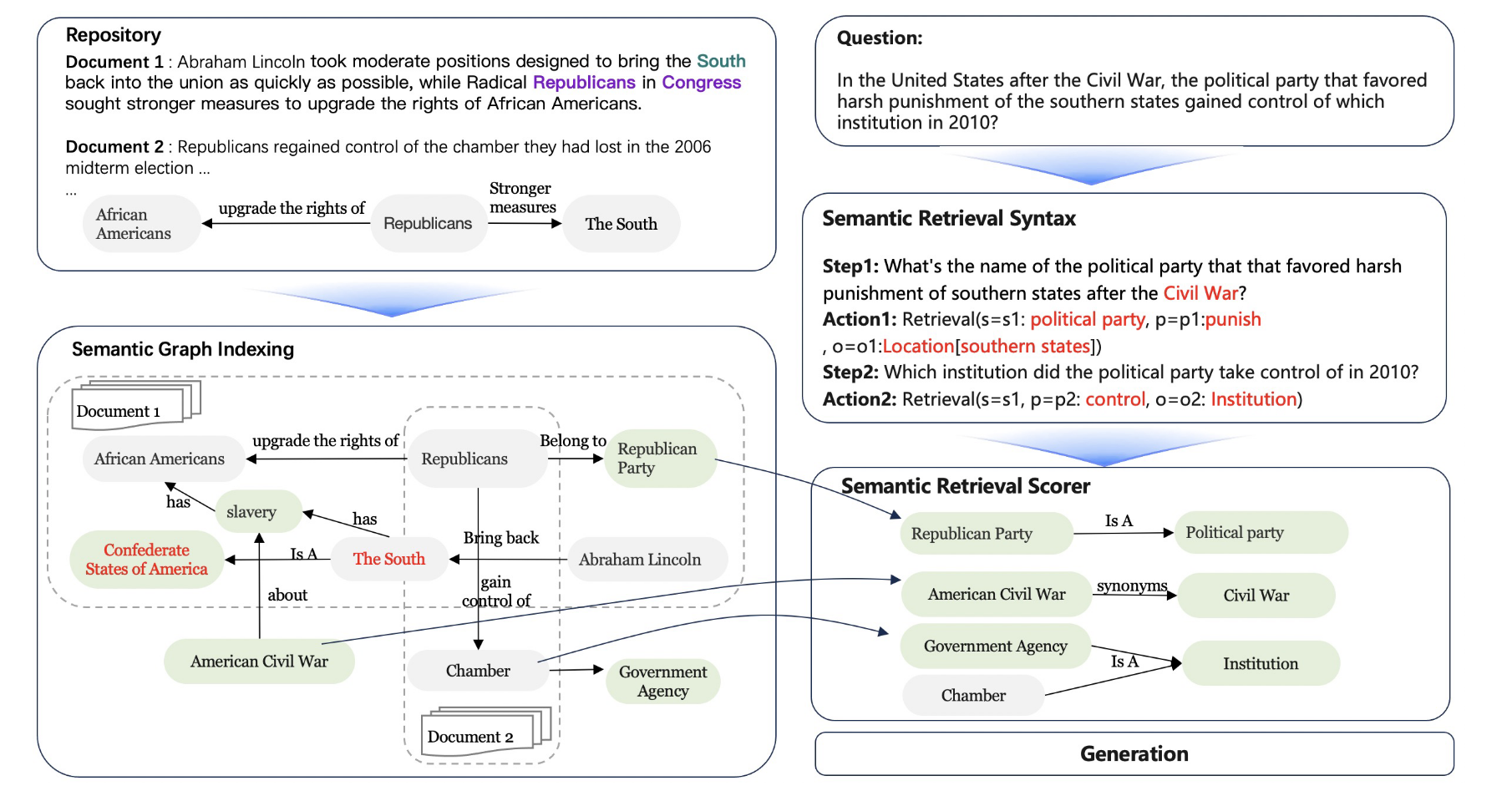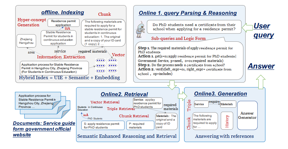 - 语义图索引:从文档中提取实体和关系,然后进行各种语义增强,形成语义图。该语义图融合了新生成的概念节点和语义关系边,有效地桥接了多个文档,可作为知识库的混合索引。该混合索引既支持复杂的逻辑推理,又支持模糊的相似性搜索,同时保持了清晰的语义结构。