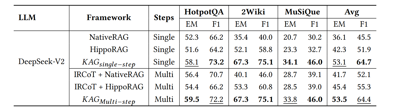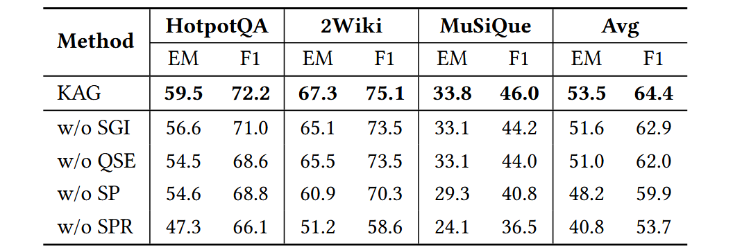 - 在3个复杂问答任务中的实验结果表明,KAG显著优于其他广泛采用的RAG方法,具有更高的检索和答案准确率。
