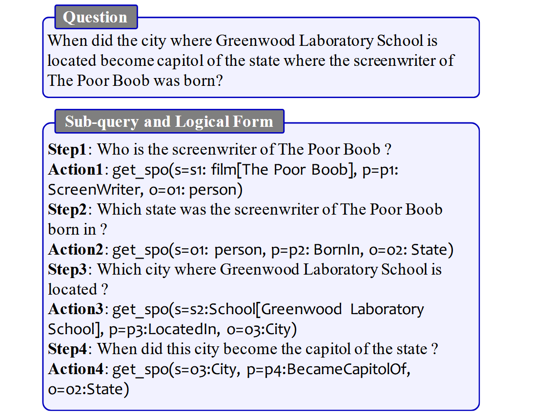 如图7所示,该过程首先将用户的原始查询 qqq 分解为一个子查询序列 s=[s1,s2,...,sn]s = [ s_1 , s_2 , ... , s_n]s=[s1,s2,...,sn],其中 sis_isi 为第 iii 个自然语言子查询。与思维链 (Chain of Thought,CoT) 一样,子查询是对原始查询的逻辑分解。每个子查询比原始查询更简单,通常只涉及到一跳的逻辑推理。随后,每个子查询被翻译成一种称为逻辑形式( Logical Form,LF )的图检索语言。那么原查询可以改写为: