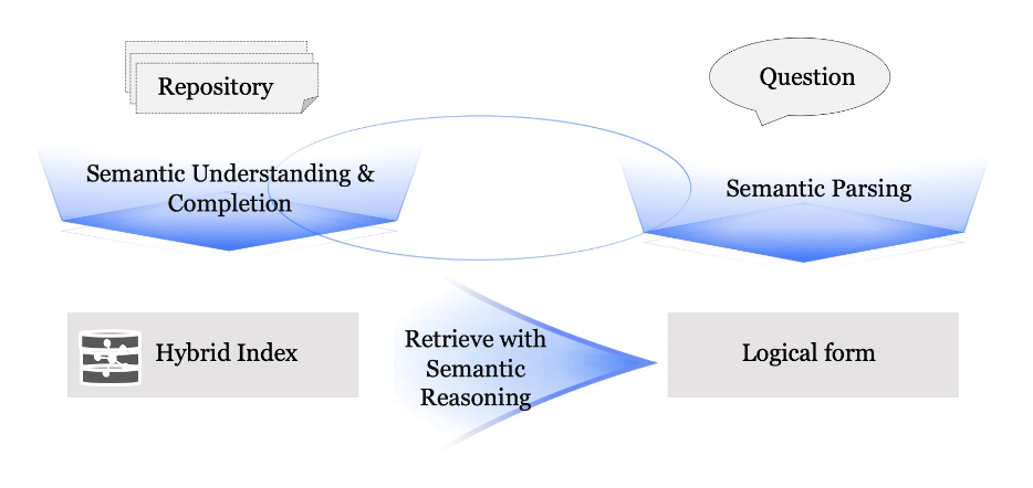 首先,在离线索引阶段,通过预测实体类型、上位概念、同义词、共现关系等关键词之外的潜在语义信息,如共现KG(如Concept Net ),对提取的关键词形成的图进行增广,使提取内容与语义推理内容共同构成知识库的索引。这使得每个关键词具有更明确的语义信息,增加了关键词之间的连接性。其次,本文利用语义解析将自然语言问句转换为一种名为Logical Form的检索语法,以捕获问句中的语义类型和关系。对于一个给定的问题,可以解析多个逻辑形式子句,每个逻辑形式子句都指向一组SPO(主谓宾)。 变量可以在不同子句之间共享,以实现多跳查询。第三,在检索阶段,预测逻辑形式的关键词与索引中的词之间的语义关系。这种预测充当了用户提问和索引之间的桥梁,取代了模糊的文本相似度作为检索的依据。