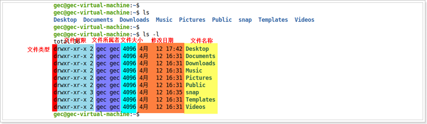 功能:显示目录下的文件 / 目录,默认显示当前目录。常用选项与示例:
