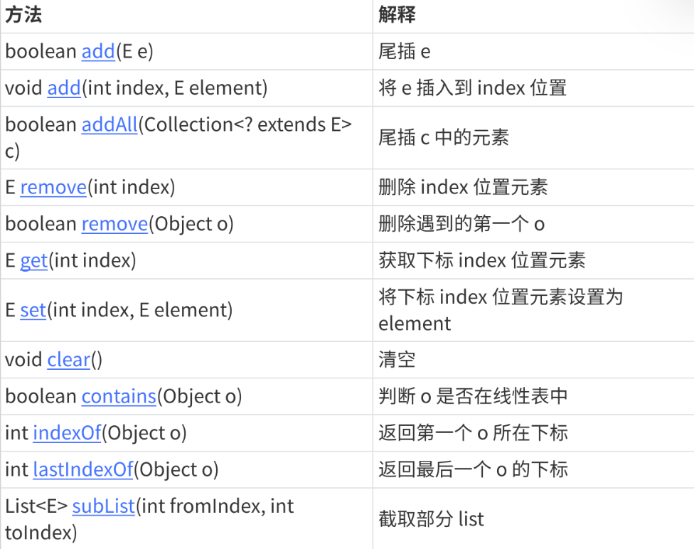 public static void main(String[] args) {List<String> list=new ArrayList<>();list.add("JavaSE");list.add("JavaWeb");list.add("JavaEE");list.add("JVM");list.add("测试课程");System.out.println( list);//获取list中有效元素的个数System.out.println(list.size());// 获取和设置index位置上的元素,注意index必须介于[0, size)间System.out.println(list.get(0));list.set(0,"JAVA");System.out.println(list.get(0));System.out.println( list);// 在list的index位置插⼊指定元素,index及后续的元素统⼀往后搬移⼀个位置list.add(0,"JAVA2");System.out.println(list);// 删除指定元素,找到了就删除,该元素之后的元素统⼀往前搬移⼀个位置list.remove("JVM");System.out.println(list);// 删除list中index位置上的元素,注意index不要超过list中有效元素个数,否则会抛出下标越界异常list.remove(0);System.out.println(list);// 检测list中是否包含指定元素,包含返回true,否则返回falseif (list.contains("JavaEE")){list.add("测试课程");}// 查找指定元素第⼀次出现的位置:indexOf从前往后找,lastIndexOf从后往前找list.add("JavaSE");System.out.println(list.indexOf("JavaSE"));System.out.println(list.lastIndexOf("JavaSE"));// 使⽤list中[0, 4)之间的元素构成⼀个新的SubList返回,但是和ArrayList共⽤⼀个elementData数组List<String> ret=list.subList(0, 3);System.out.println(ret);list.clear();System.out.println(list);}