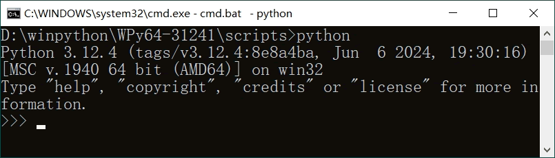1) 首次启动,双击 “WinPython Command Prompt.exe”,输入 python 进入交互界面,如下图所示: